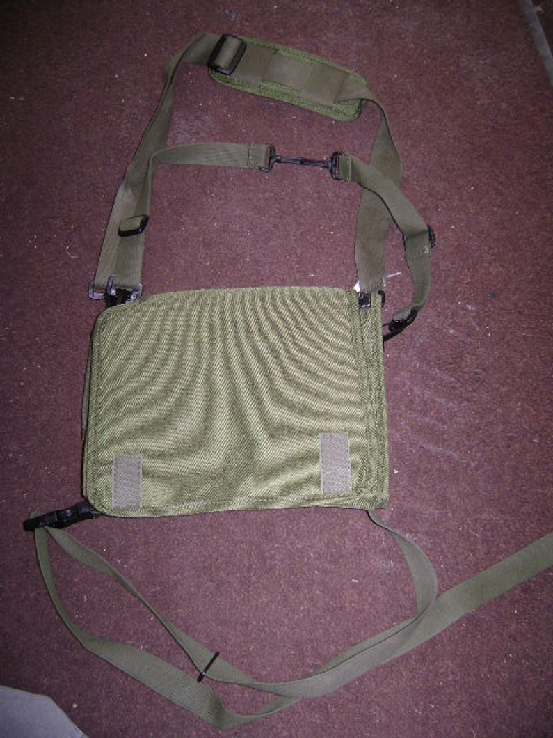 Heavy nylon, green, padded/adjustable shoulder strap, 10" x 4" x 8", velcro flap exposes the area where the radio would be, antenna opening, leg strap, clear plastic map display (7-1/2" x 5-1/2"), plastic and metal hardware.