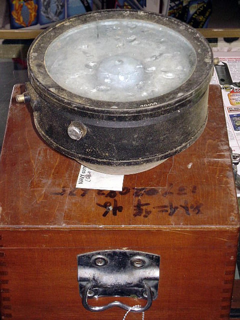 Vintage nautical compass in wooden storage/carry box, liquid filled, glass cover, original condition with slight storage wear, box 8-3/4" x 8-3/4" x 5-1/4" (lockable), compass - 6" tall x 9-1/2" diameter - works-