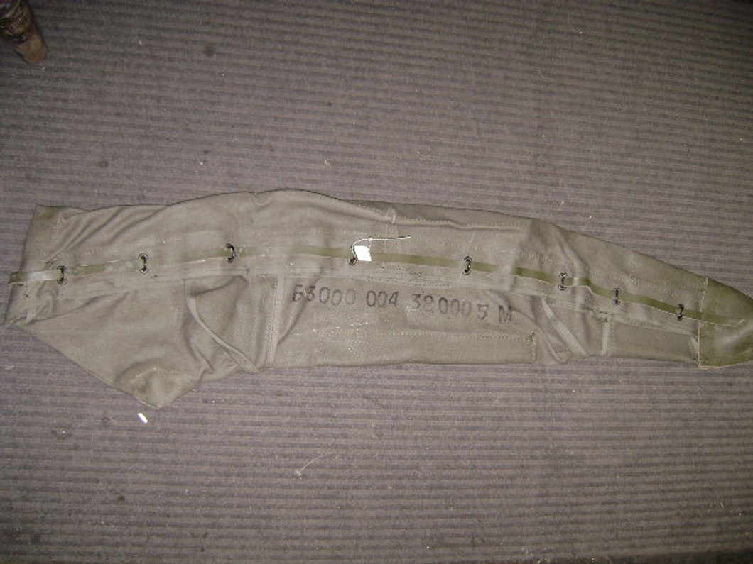 Canvas, leather strap locks opening flap, leather barrel end, 41" long x 10" (at widest point) x 5" (at narrowest point), unknown what caliber/rifle it fits, very heavy canvas.