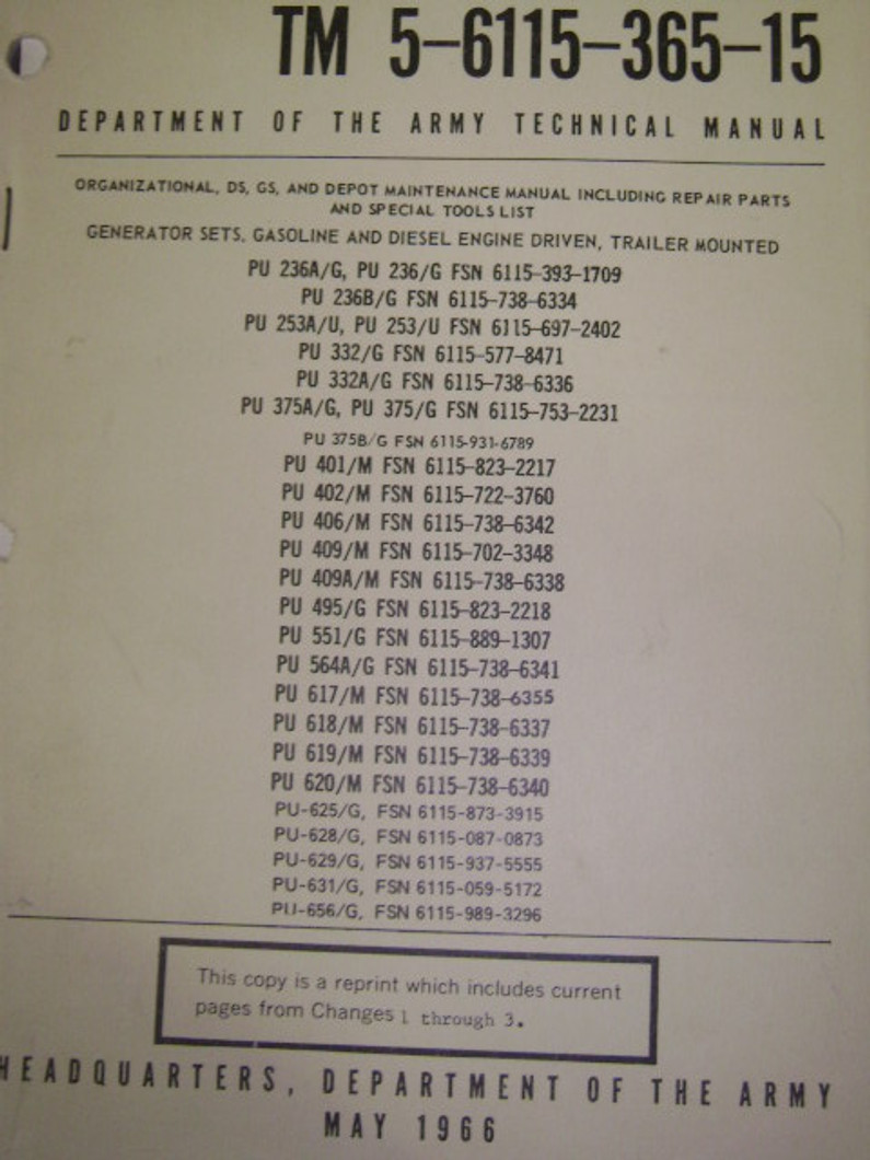 TM 5-6115-365-15, organizational and maintenance manual for many different models (see picture), Department of the Army, May 1966