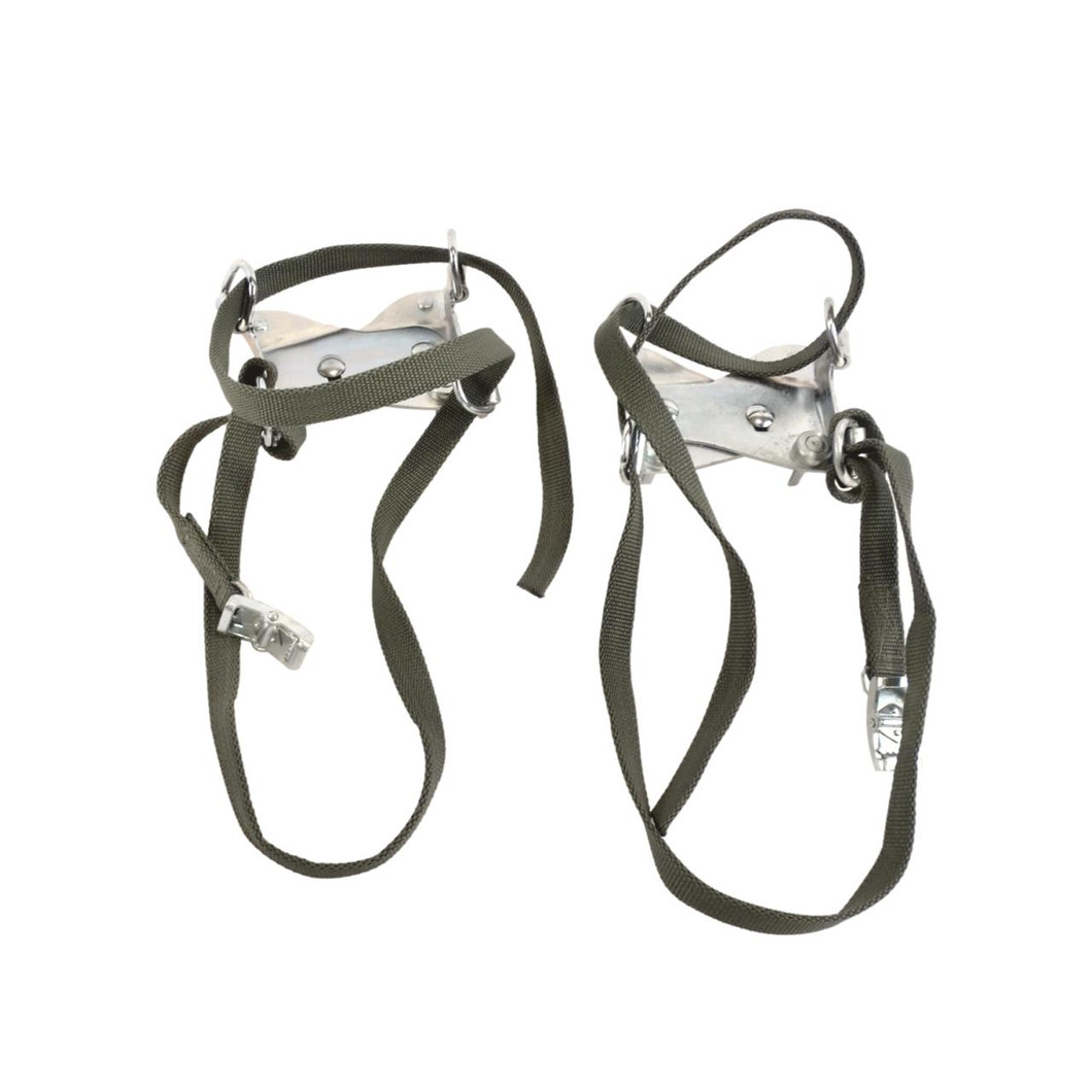 Brand new, metal base and spikes, adjustable nylon web straps fit over a variety of boots.