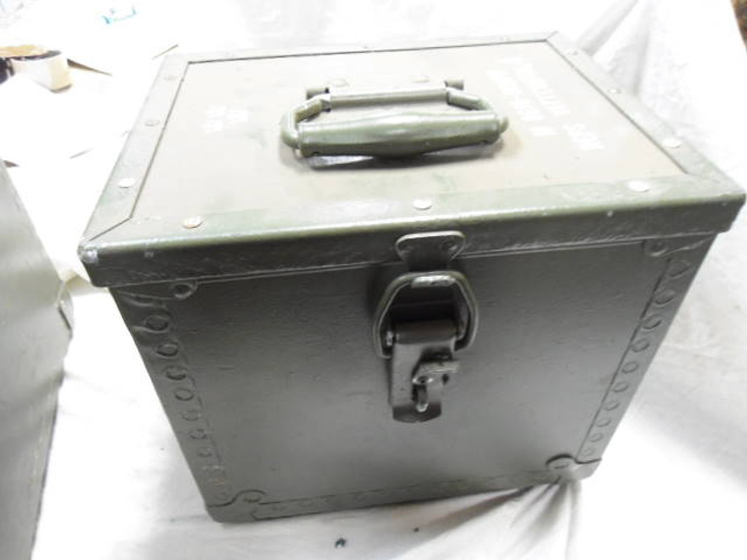 Used, wood box with metal trim, very solid, well built, locking latch, top carrying handle, 11.62" x 11.25" x 8.5" (exterior), may have small pipe fittings and clamps inside the box, box weighs approximately 14 lbs.
