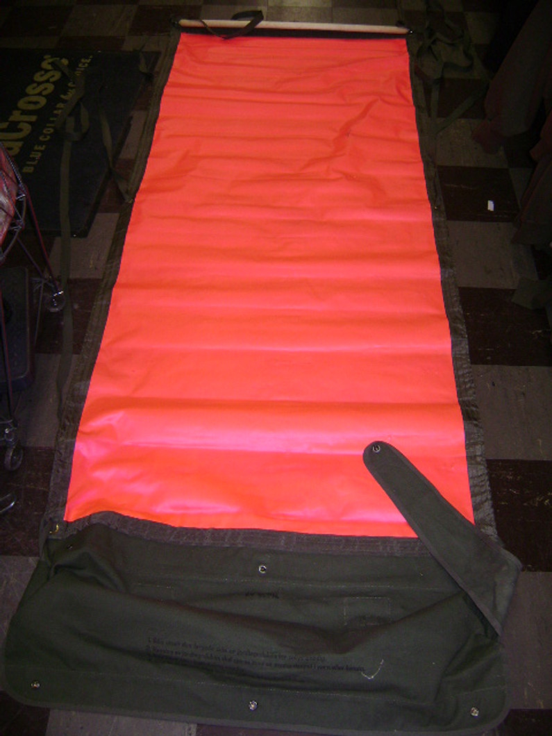 Olive drab canvas, 72" x 32", rolls up, bright reflective side (orange or pink), tie down straps.