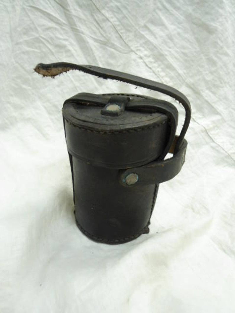 Used, black leather, unknown use but most likely a monocular pouch, attaches to a belt, 3.25" tall, 2" diameter, leather is aged.