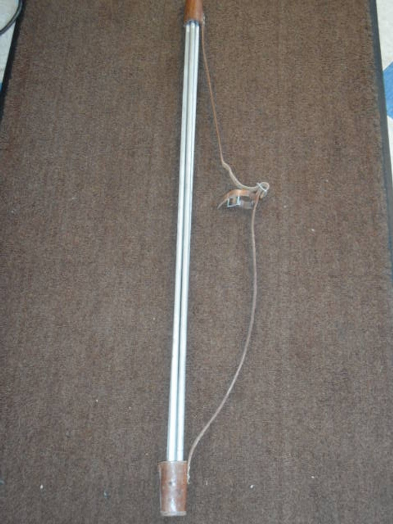 Used, good condition, dated 1960s, leather strap kees poles together when not in use, inludes four aluminum poles measuring 43″, the leather has the Swiss Cross stamped on it.