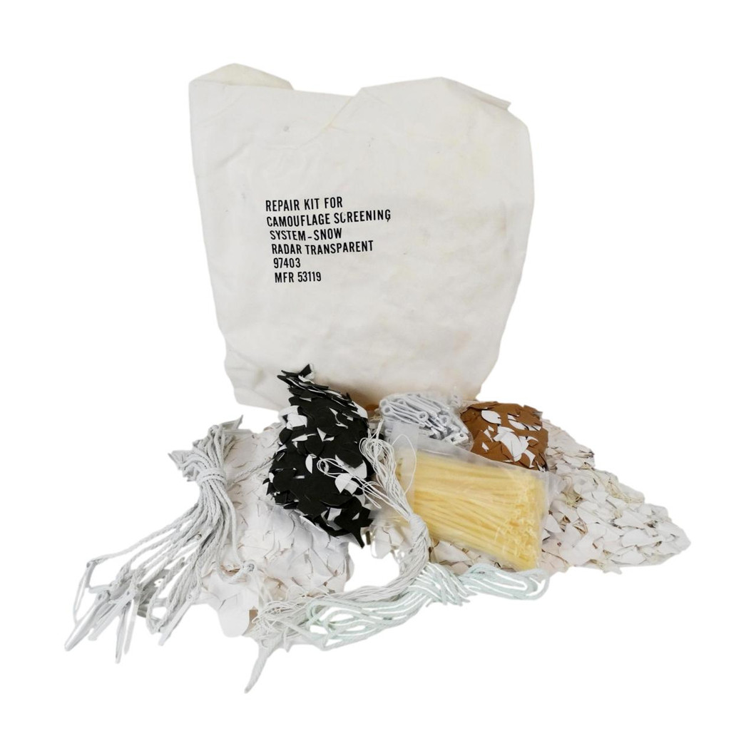 Repair kit for camouflage screening system (snow) radar transparent, multiple patch pieces with appropriate rope/cord, rubberized storage bag included, available in desert camo