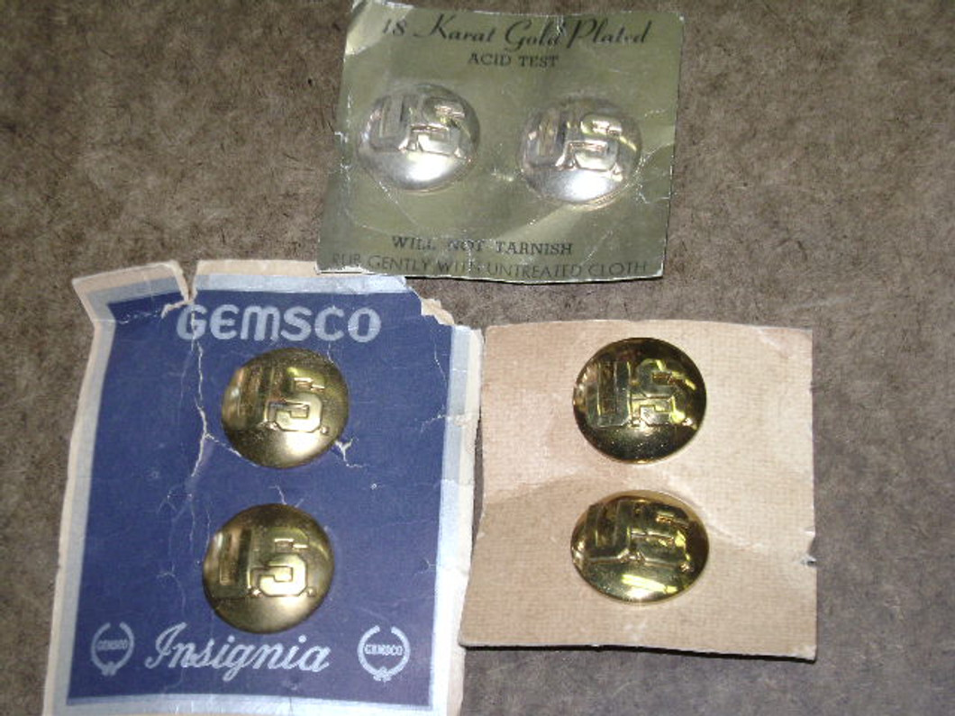 New/never issued, various manufacturers, sold in 20-packs (10 pairs), 18 karat gold plated (will not tarnish), letters U & S.