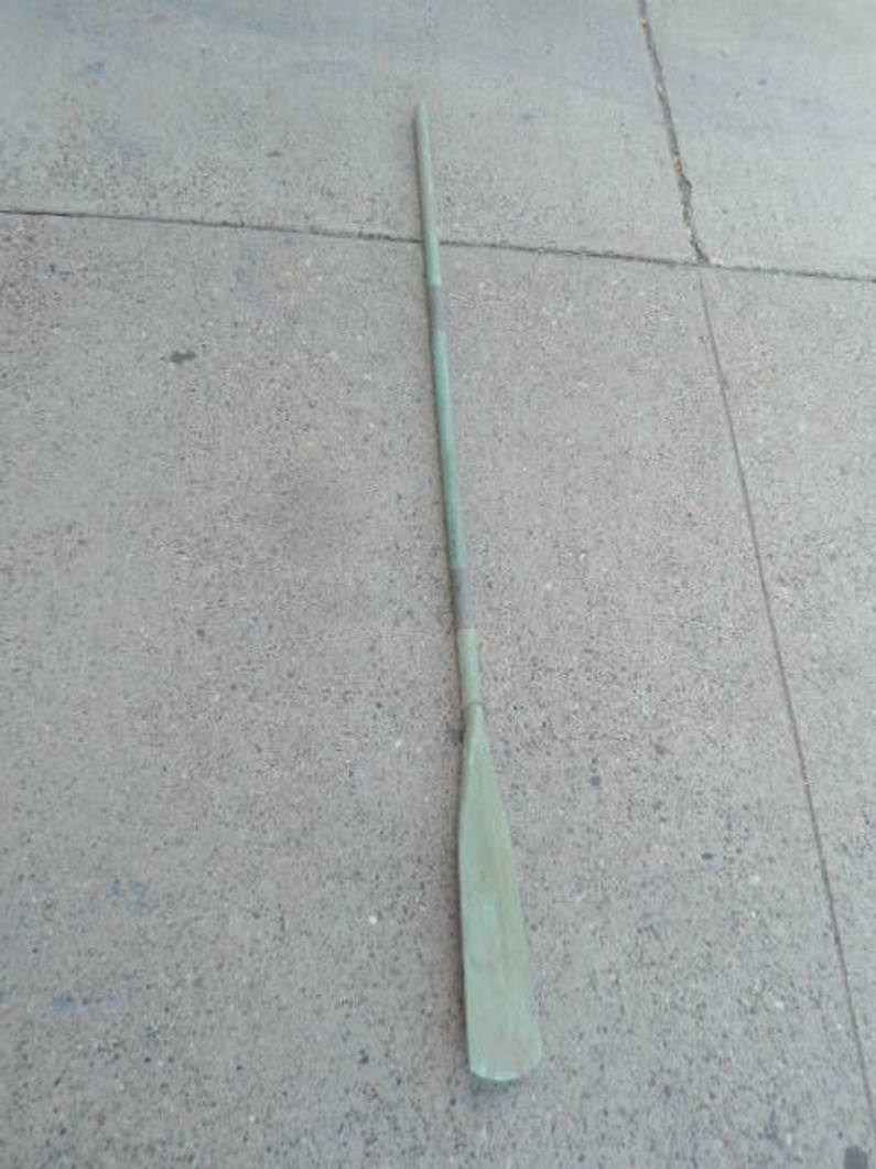 Used, wood, 6' long, oar locks, no dates, poles break apart into two pieces.