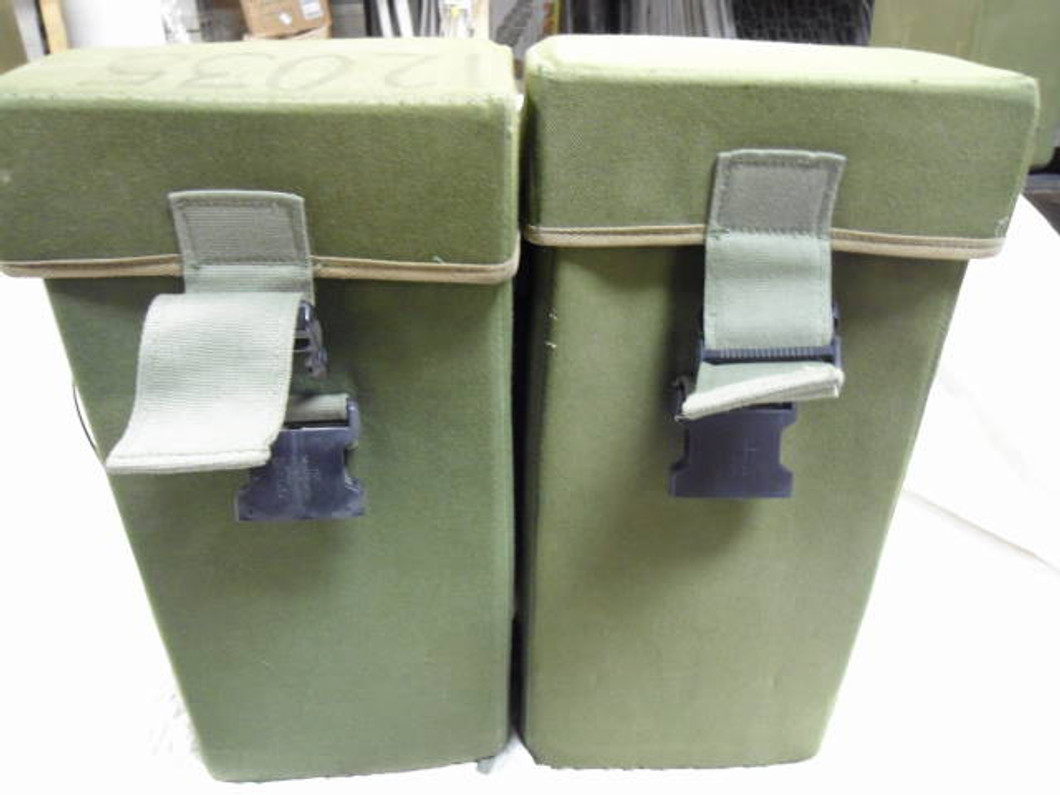 Used, good shape, olive drab, two cases zip together, plastic Fastex buckles, adjustable shoulder strap, attached lid, each case is 17" tall, 8" wide and 5.5" thick.