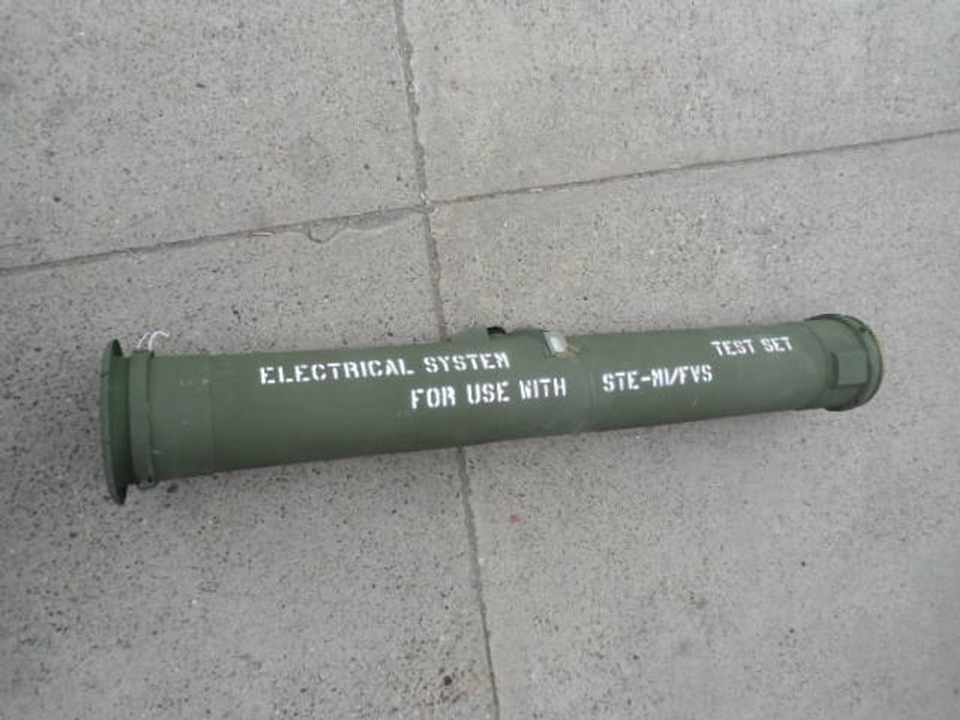 New, inert, missile test container, NSN: 4910-01-142-3144, part no. 12328317, serial number L00116, MFR- Letter Kenny Army Depot, lightweight aluminum, stamped "Electrical System for use with the STE-M1/FVS, 50" tall, 7.5" diameter.