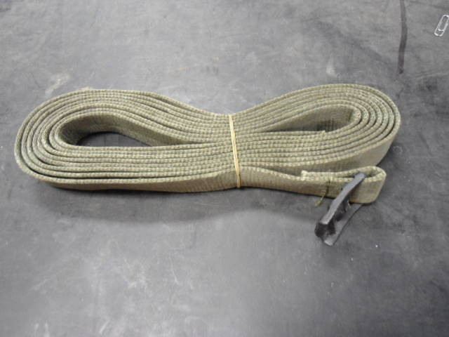 Old stock, 1" nylon webbing, approximately 13' 6" long, metal buckle, great utility strap for everyday use, olive drab webbing.