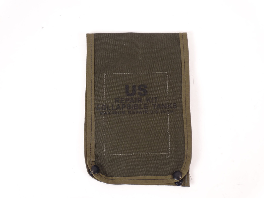 Original, un-issued condition US Military Collapsible Tanks Repair Kits. There are no contents in the bag. These are made of olive drab canvas with snap button closure.