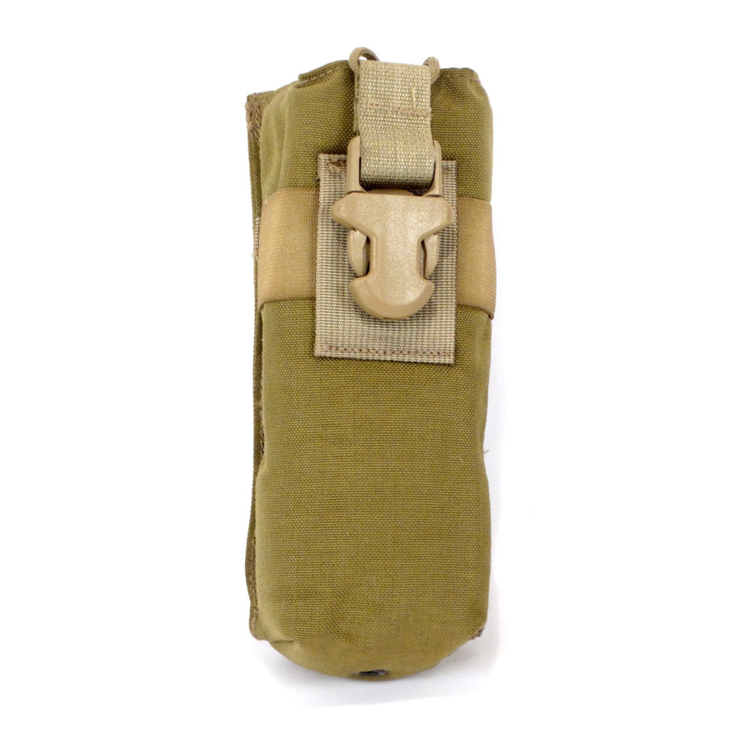 Khaki cordura nylon, designed for the PRC-148 MBITR or similar sized radio, buckle/paracord top strap, elastic retention on the side, grommet on bottom for drainage, 8″ x 3″ x 2″, NSN: 8415-00-529-2113, MOLLE, variety of manufacturers