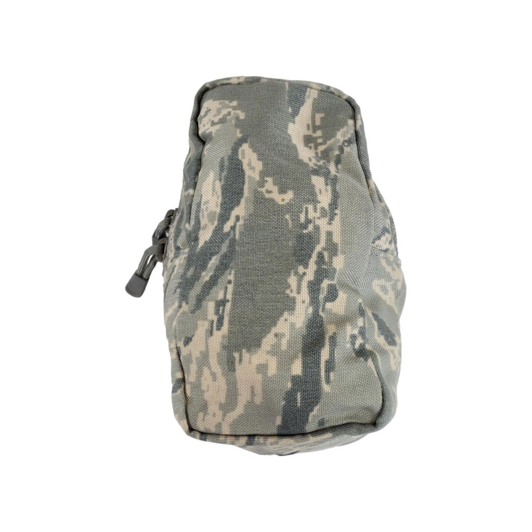 MOLLE straps, ABU camouflage, nylon, approximately 7″ x 4″ x 4″, interior pocket, drain grommet in the bottom, two heavy duty zippers that open from either direction, no label or MFR stamp