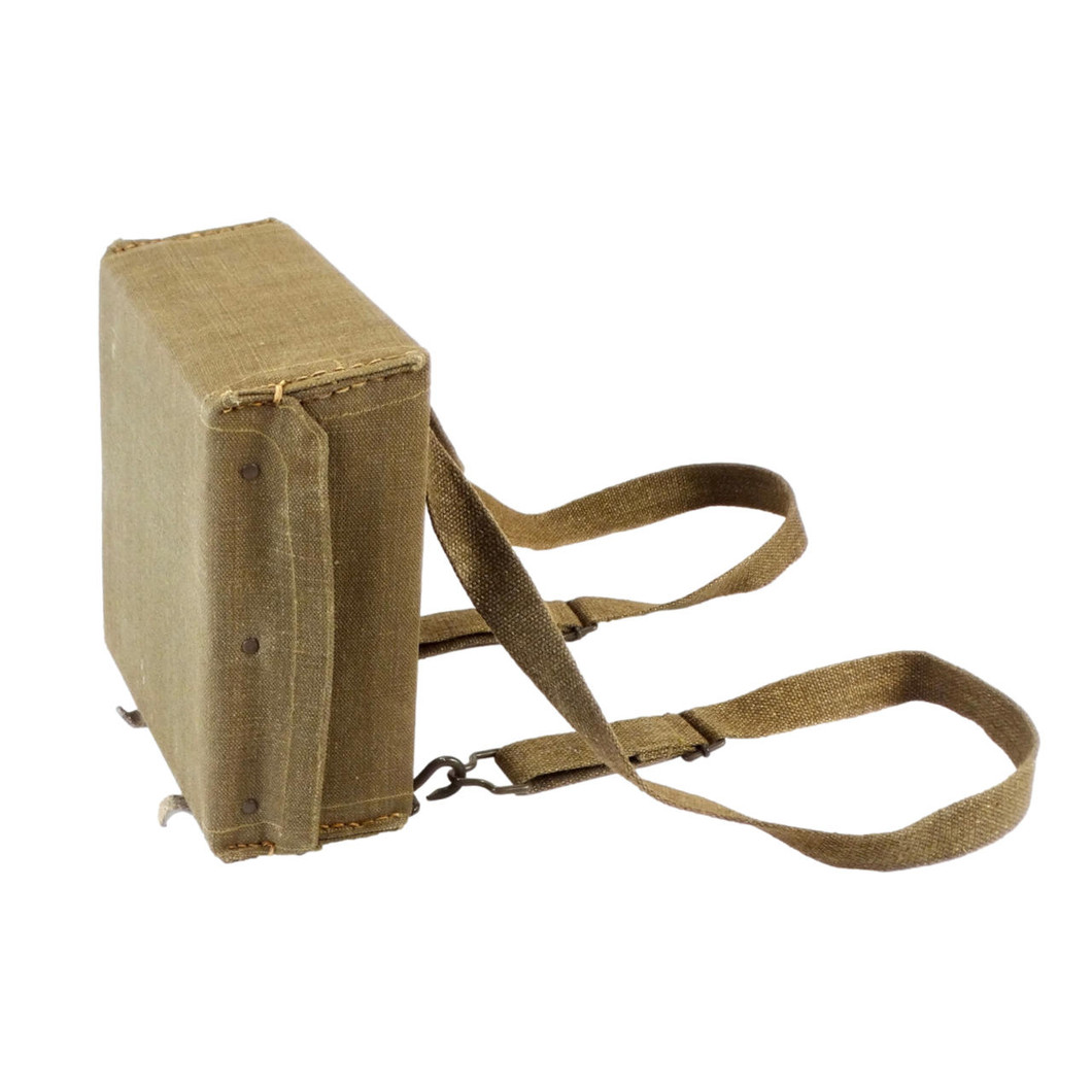 WWII era, canvas cover, metal box inside, leather strap closure, 8.5" x 8.5" x 4", cotton web backpack adjustable straps (1.25" wide), used/excellent condition.